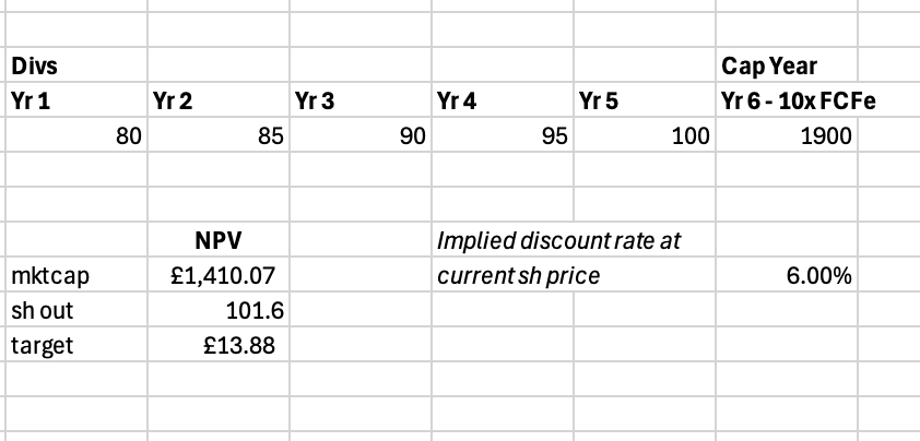 Multiplying that through gives a cash contribution in that year of around £200m (given mix of franchise-non franchise), which is not far off EBITDA (pre-IFRS 16) of £180m that year. This year that pre-IFRS EBITDA is likely to be around £280, which would back solve to approx £122,000 of cash contribution for owned stores and £42,000 for franchises (assuming 2100 owned and 575 franchised stores). Lets then scale this up to the 3500 target (say 2700 owned stores and 800 franchises) at £130k and £45k apiece of shop cash contributions (net of support) and we would get to approx £390m cash contribution before maintenance capex. Deduct £150m of maintenance capex and corporation tax and you get around £190m FCF (pre interest). Thats around 9x today’s market cap but obviously is 6 years away. Lets give them the benefit of dividends in the interim but we can see that a basic NPV capitalising that forecast FCF at 10x in year 6 would suggest the shares are pretty rich: