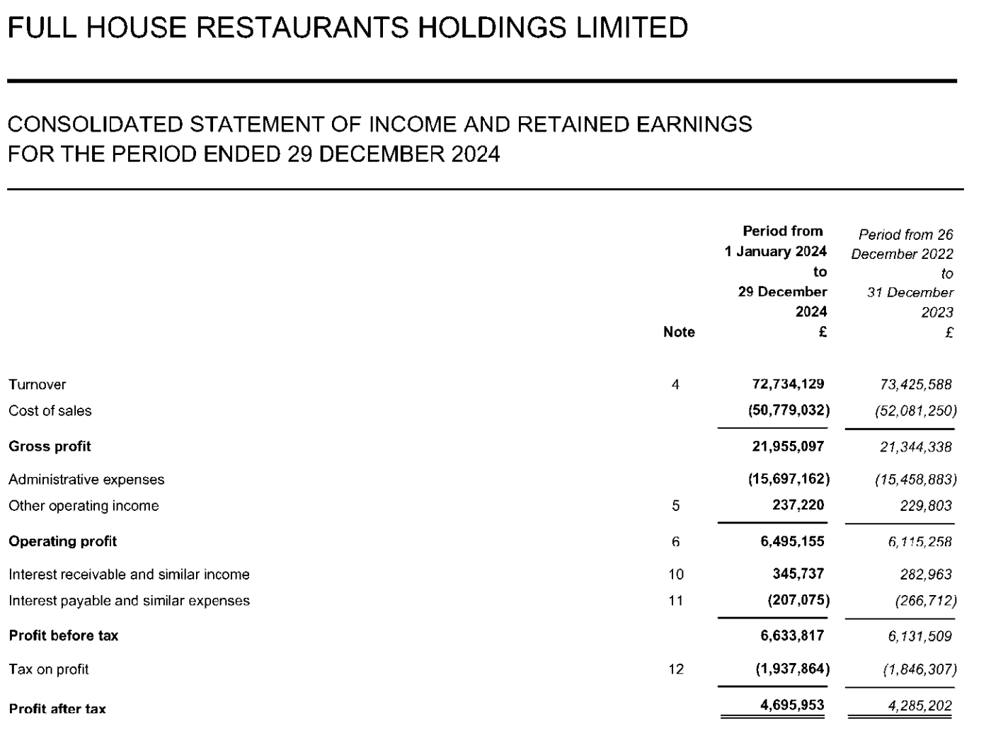 Then we turn to Domino’s. There, it is a different story. There IS more capacity to grow the network of takeaway/delivery outlets: compared to Gregg’s the saturation level isn’t that great. However, the category has become tougher of late: pizza is losing share to other takeaway food categories, and aggregators like Deliveroo and Just Eat are bringing those options to consumers more easily. We have seen rivals Pizza Hut closing stores as it goes into administration (68 diners and 11 takeaway/delivery sites) and 10% of Papa Johns sites will close. In theory that’s good for Domino’s and shows their “fortressing” approach is working (the practice of adding new sites on the radial fringes of existing ones) both defensively and also in terms of the potential to take share vacated by the other two. However, it also points to the stresses within the sector highlighted by Domino’s own poor like for like volume growth figures. Domino’s only does well when its franchisees grow volume (yes sales given the 5.5% royalty, but more volume given it makes most money on its supply of commissary to franchisees). We can see how in 2024 even the most successful franchisees have struggled to deliver like for like volume growth - here’s Full House Restaurant Holdings, Bradley Sheddon’s business where Dominos UK owns a 49% stake: